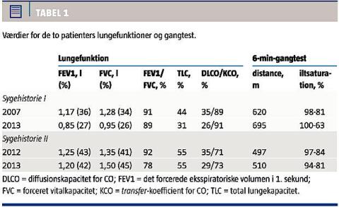 patienten desaturerede ved seksminuttersgangtest (Tabel 1). Hun havde frem til 2013 uændrede symptomer og uændret højt træningsniveau. I 2013 var lungefunktionen faldet yderligere, og hun desaturerede yderligere ved gangtest (Tabel 1).
