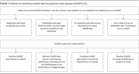Ifølge de seneste SUDEP-kriterier, The unified SUDEP criteria, fra 2012 defineres SUDEP som et pludseligt og uventet dødsfald, der sker bevidnet eller ubevidnet, og som ikke er relateret til traumer eller druknedød. Dertil skal status epilepticus udelukkes, og en efterfølgende obduktion skal ikke finde en dødsårsag [12]. SUDEP kan underinddeles i kategorierne definite, definite plus, probable og possible SUDEP ud fra graden af information om omstændighederne og årsagerne til det pågældende dødsfald (Figur 1).
