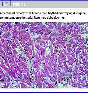 Ved mikroskopisk undersøgelse fandtes hypertrofi af myokardiet, enkelte steder med accentueret hypertrofi af fibrene med tilløb til disarray og disorganisering, og enkelte steder var der fibre med dobbeltkerner, let interstitiel fibrose samt let fortykkelse af endokardiet i venstre ventrikel (Figur 1 ).