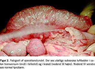 I. En 21/2 år gammel dreng blev indlagt akut med øreflåd, høj feber og påvirket almentilstand og sat i antibiotisk behandling. Fund af lymfeknudesvulst, anæmi og leukopeni førte til diagnosen akut lymfatisk leukæmi og behandling med prednisolon, vincristin, adriamycin og methotrexat. Efter 13 dage fik han mavesmerter og diaré. Abdomen var meteoristisk, men blødt med livlige tarmlyde og flatulens. Der kunne ikke påvises tarmpatogene bakterier. Efter flere antibiotikaskift blev drengen afebril, men havde stadig intermitterende mavesmerter og opdrevet abdomen. En røntgen af thorax viste pneumomediastinum. En røntgenoversigt over abdomen (OOA) viste fri luft og intramural luft i tarmvæggen (Figur 1 ). På mistanke om perforeret NEC blev drengen laparotomeret. Tarmen var overalt vital og uden tegn på perforation, men der var luft i tarmvæggen i colon ascendens og transversum samt i krøset, omentum majus og omentum minus (Figur 2 ). Der blev anlagt aflastende loop-ileostomi. Postoperativt var forløbet roligt med gradvis bedring over dage. Drengen fortsatte med antibiotisk behandling (piperacillin + tobramycin + metronidazol) og kost efter ønske. Der kunne ikke påvises infektion med Clostridium difficile . På grund af blodig afføring to dage efter operationen blev der taget ny OOA, som viste uændret PI. Seks dage efter operationen var drengen velbefindende, abdomen var blødt, og OOA på syvende postoperative dag viste ingen sikker intramural luft. Ved lukning af stomien to en halv måned senere fandtes ingen intramural luft. Siden var drengen abdominalt velbefindende fraset obstipationsproblemer.
