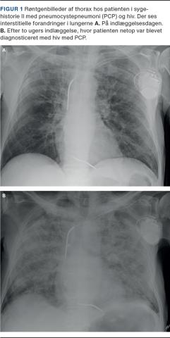 II. En 71-årig mand, som havde kronisk obstruktiv lungesygdom (KOL) og iskæmisk hjertesygdom, blev indlagt på en lungemedicinsk afdeling på mistanke om COVID-19. Han var igennem mange måneder blevet tiltagende træt, appetitløs og afkræftet og var nærmest bundet til sengen. Han havde hypoksi med en saturation på 92% og det parakliniske billede med lymfocytopeni, et CRP-niveau på 37 mg/l, anæmi, et LDH-niveau på 296 E/l og en røntgenundersøgelse af thorax (Figur 1), hvorpå der sås interstitielle forandringer, henledte mistanken på COVID-19. Trakealsekretet blev undersøgt, og han blev podet i alt fire gange for SARS-CoV-2. Alle test var negative. Hans tilstand forværredes under indlæggelsen, han blev delirøs og febril, hostede og fik progredierende behov for ilt. Han blev sat i bredspektret antibiotisk behandling uden effekt, udredt for KOL-eksacerbation og akut myokardieinfarkt uden ST-elevation, og der var mistanke om en underliggende malign tilstand. Efter to ugers indlæggelse blev PCP overvejet som differentialdiagnose, og polymerasekædereaktionstest for pneumocyster på trakealsekret var positiv. Efter konference med en infektionsmedicinsk afdeling blev udført hiv-kviktest, der udkom positiv. Patienten blev overflyttet til en infektionsmedicinsk afdeling, hvor der blev iværksat behandling for PCP og hiv. CD4-tallet var 14 celler/µl.