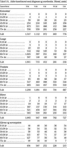 Uanset køn levede kun 1.225 af 3.149 (39%; 38,4-39,6%) patienter med lungecancer længere end et halvt år. I alt 2.355 af 3.135 (75%; 74,4-75,6%) patienter med kolorektalcancer levede mere end et halvt år. I alt 1.091 af 1.299 (84%; 83,5-84,5%) mænd med prostatacancer havde en overlevelse på mindst et halvt år. I alt 3.168 af 3.347 (95%; 94,7-95,3%) kvinder med brystcancer levede over et halvt år. I alt 1.470 af 1.699 (87%, 86,6-87,4%) kvinder med underlivscancer havde en overlevelse på mere end et halvt år (Tabel 1A og Tabel 1B ).