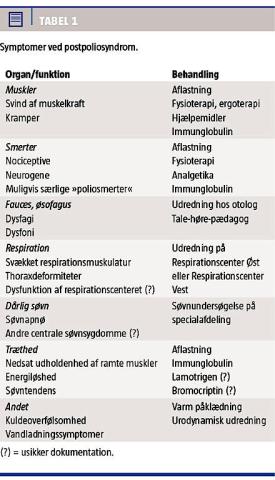 Approximately 7000 Danes are still living with sequelae after surviving an acute polio infection. Late effects of polio include deformities, arthrosis and overloaded muscles. In the long run polio patients are at risk of having a further decrease of muscle function and a wide variety of other symptoms, a condition called post-polio syndrome (PPS). Treatment of PPS is in general symptomatic. Recently it has been shown that treatment with intravenous immunoglobulin may have an effect on pain, tiredness and walking distance. Patients with prior polio have an increase in morbidity and mortality, and may be more sensitive to a variety of medicine.