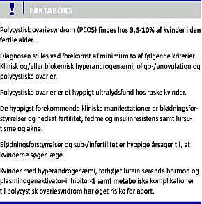Summary Polycystic ovary syndrome and miscarriage Ugeskr Læger 2011;173(6):425-430 Polycystic ovary syndrome (PCOS) causes impaired fertility and is assumed to be associated with increased risk of miscarriage. This paper reviews the literature according to the principles of evidence-based medicine to establish whether PCOS and the clinical findings lead to an increased miscarriage rate. Conclusion: It is not possible to confirm any association between PCOS and miscarriage. Increased LH, androgens and plasminogen activator inhibitor-1 (PAI-1) activity as well as obesity and impaired endometrial blood flow are to some degree associated with miscarriage.