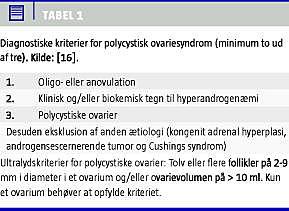PCOS er den hyppigst forekommende endokrinologiske og gynækologiske lidelse blandt fertile kvinder med en prævalens på 3,5-10% [1, 13, 14]. PCOS har gennem årene været defineret forskelligt [15, 16]. I nyere artikler indgår ultralydsskanning af ovarier i diagnosen, men i ældre artikler fokuseres på forhøjet luteiniserende hormon (LH) og LH/follikelstimulerende hormon (FSH)-ratio. I Tabel 1 ses de diagnostiske kriterier, der har været de anbefalede siden 2003.