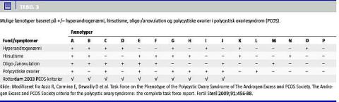 Efter 2003-kriterierne er gruppen af PCOS-kvinder heterogen med hensyn til kliniske manifestationer og fænotyper [15, 16], Tabel 2 og Tabel 3 . Klassisk PCOS var karakteriseret ved kvinder, der var overvægtige, med mandlig hårvækst og infertile. Efter den nye definition er der slanke PCOS-kvinder med sub-/infertilitet og polycystiske ovarier (PCO) som eneste symptomer [16]. Øget forekomst af spontan abort anses for en del af de fertilitetsproblemer PCOS-kvinder har.