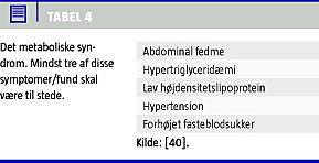 PCOS har mange fællestræk med metabolisk syndrom (MBS) og betragtes som en undergruppe af dette. De diagnostiske karakteristika ses i Tabel 4 . Hyperandrogenæmi er en stærk, positiv prædiktor for MBS og tydeliggør koblingen mellem MBS og PCOS [25, 26]. Mellem 60 og 70% af PCOS-kvinder er overvægtige i større eller mindre grad [13, 15]. Alle svært overvægtige (BMI > 30) anses for at være insulinresistente, og totalt set er op mod 50% af alle PCOS-kvinder insulinresistente [16]. PCOS-kvinder har dog ikke højere fasteblodsukker end raske [27].