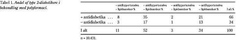 Forekomsten af dyslipidæmi blandt type 2-diabetikere er af størrelsesordenen 20-50% (14, 16). Tallene fra Århus Amt tyder på en underbehandling, idet kun 14% fik lipidsænkende behandling.