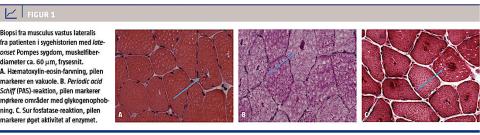 En 22-årig kvinde med transaminasæmi blev henvist fra egen læge til en hepato-gastroenterologisk afdeling. Patienten havde søgt læge pga. træthed, »infektionsfornemmelse« og »syre« i musklerne. Symptomerne var tiltaget over en årrække. Den objektive undersøgelse viste normale forhold. Den biokemiske udredning med screening for autoimmune, metaboliske og infektiøse årsager var upåfaldende fraset vedvarende forhøjelse af alaninaminotransferase (ALAT) (120-131 E/l). Ultralydundersøgelse af leveren viste normale forhold. En leverbiopsi viste uspecifik sinusoidal dilatation. På mistanke om muskelsygdom som årsag til ALAT-koncentrationsforhøjelsen suppleredes blodprøverne med måling af koncentrationerne af kreatinkinase (CK), aldolase, aspartataminotransferase og laktatdehydrogenase, og alle var forhøjede med en faktor 3-6. Patienten blev henvist til en reumatologisk afdeling på mistanke om inflammatorisk muskellidelse. Idiopatisk myositis og systemisk bindevævslidelse blev afkræftet, bl.a. var alle myositisantistoffer negative. Pga. et forhøjet CK-niveau og et langstrakt forløb blev der taget biopsi fra m. vastus lateralis. Ved lysmikroskopi fandtes muskelfibre med vakuoler med indhold af periodic acid Schiff-positivt materiale, delvis diastaseresistent, og områder med øget aktivitet af sur fosfatase, hvilket gav mistanke om glykogenose type II (Pompes sygdom) (Figur 1). Diagnosen understøttedes af elektronmikroskopi med fund af fritliggende og membranomgivet glykogen i muskelfibre. Patienten blev videreudredt i neurologisk regi. Aktiviteten af alfaglukosidase, bestemt ved dried blood spot (DBS) og i leukocytter, var nedsat. Ved genetisk testning blev patienten fundet heterozygot for mutationerne c.-32-13T>G og c.525del, p.Glu176Argfs*45 i glucosidase alpha acid-genet. På baggrund af ovenstående kunne diagnosen late-onset Pompes sygdom stilles. Supplerende anamnese afslørede symptomdebut i skolealderen, hvor hun løb langsomt. Fra 16-årsalderen forværres trætheden og funktionsniveauet. Hun måtte hvile midt på dagen, kunne ikke cykle op ad bakker og kom ikke i bedre form trods fitnesstræning. Tid fra første lægekontakt til diagnose var seks år. Fraset lettere kraftnedsættelse over skuldre og hofter var hun neurologisk intakt. Før påbegyndelse af enzymterapi var forceret vitalkapacitet (FVC) siddende 87% af forventet og liggende 76% af forventet. Seks minutters gangtest var normal.