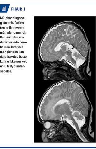 Målingerne af syre-base-forhold, kreatinkinaseniveau, thyroideaprofil samt infektions- og levertal var alle normale. En urinmetabolisk screening og øjenundersøgelse var også uden bemærkninger. Der blev tidligt lavet ultralydskanning af cerebrum, og skanningen viste ikke noget abnormt. En MR-skanning af cerebrum nogle uger senere viste en underudviklet cerebellum (Figur 1).