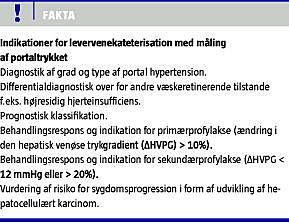 Levervenekateterisation med måling af portaltrykket foretages i dag kun få steder i Danmark. Undersøgelsen har tidligere været forbundet med eksperimentelle og klinisk kontrollerede undersøgelser. Resultaterne fra flere kliniske undersøgelser peger efterhånden på, at levervenekateterisation med bestemmelse af portaltrykket bør have en mere fremtrædende plads i udredningen af den portal hypertensive patient. Der er i dag en række indikationer, ved hvilke udførelse af levervenekateterisation med måling af portaltrykket bør overvejes (se faktaboks). Måling af portaltrykket giver vigtig information om graden og typen af portal hypertension. Målingerne indeholder betydelig prognostisk information om både overlevelse, udvikling af komplikationer, herunder klinisk dekompensation og udvikling af leverkræft. Endelig har behandlingsresponset på betablokkere i helt nye arbejder vist sig at kunne forudsige det kliniske forløb og behandlingseffekten med hensyn til blødning og mortalitet i relation til primær/sekundær profylakse. Der skal således være adgang til måling af portaltrykket på afdelinger, der udreder og behandler patienter med portal hypertension.