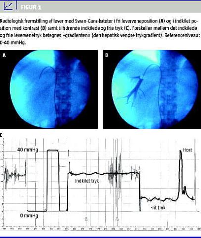 Portal hypertension er en af de væsentligste komplikationer til kronisk leversygdom og påvirker i betydelig grad morbiditet og mortalitet [1]. Udvikling af portal hypertension fører typisk til dannelse af gastro-øsofageale varicer, væskeretention i form af ascites og ødemer samt komplikationer fra hjerne, nyrer, lunger, hjerte og kredsløb [2-4]. Portal hypertension inddeles i præhepatisk, intrahepatisk eller posthepatisk portal hypertension afhængigt af årsagen [5]. I alle tilfælde er trykket i vena portae øget, mens trykfaldet over leveren er differentieret i forhold til, hvor modstanden er lokaliseret. Den hepatisk venøse trykgradient (HVPG) er defineret som forskellen mellem trykket i indkilet position i en levervene og det frie tryk i levervenerne og er normalt mellem 1-5 mmHg. Ved langt hovedparten af kroniske leversygdomme, eksempelvis ved cirrose, er den øgede trykgradient betinget af en skade efter sinusoiden (postsinusoidal), og i disse tilfælde er blodtrykket i indkilet position identisk med trykket i vena portae. Risikoen for udvikling af komplikationer øges betragteligt, når HVPG stiger over 10-12 mmHg [6-9]. HVPG og ændringer heri kan relativt nemt måles, og størrelsen af portaltrykket har vist sig at indeholde information om prognose, blødningsrisiko og behandlingsrespons og -virkning.