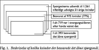 Spørgeskemaet blev besvaret af 975 kvinder, svarende til 77%. I alt 719 kvinder anførte, at de var eller havde været i overgangsalderen. Det var kun disse kvinder, der blev bedt om at besvare det åbne spørgsmål. I alt 393 besvarede spørgsmålet, og materialet til denne undersøgelse består af disse 393 besvarelser (Fig. 1).