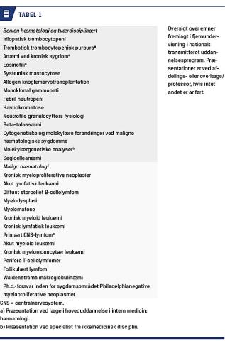 Webcast fra internationale kongresser i blodsygdomme er tilgængelige digitalt fra det europæiske og det nordamerikanske selskab. Et dansk materiale er imidlertid et væsentligt supplement, fordi national ekspertise (også på internationalt niveau) er mere tilgængelig for dialog, det bidrager til samarbejde og netværk mellem afdelingerne, og det giver yngre kolleger mulighed for at præsentere et særligt interesseområde og bidrage til deres faglige profilering (Tabel 1). Fremlæggelsen kan godkendes som kompetencen evidensbaseret medicin-opgave og præsentation.