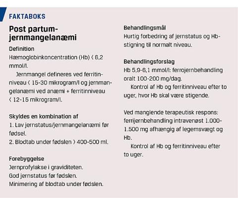 Anæmi i forbindelse med en fødsel er fortsat et betydeligt problem også i vestlige samfund [2, 30]. Hovedårsagen er præ partum-jernmangel/anæmi i kombination med blodtab under fødslen. Et blodtab på mere end 400-500 ml tømmer kroppens jernreserver og medfører længerevarende jernmangel og PP-anæmi. Kvinder med PP-anæmi er ikke i stand til at genopbygge jernreserverne alene via kosten, men behøver jerntilskud [10]. Set i lyset af den korte indlæggelsestid efter en fødsel er det hensigtsmæssigt, at den praktiserende læge tager hånd om dette, gerne som en rutine i forbindelse med helbredsundersøgelsen otte uger efter fødslen.