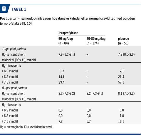 I to ældre danske undersøgelser har man målt Hb og jernstatus efter fødslen hos etnisk danske kvinder, der har haft en ukompliceret graviditet og fødsel og har fået placebo eller jerntilskud (Tabel 1) [9, 10]. I en