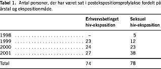 Resultater: I alt 152 personer modtog PEP, 78 efter SE og 74 efter EE. Hyppigheden af PEP efter SE steg fra fem tilfælde i 1998 til 38 i 2001. Partnerens hiv-status var ukendt i 25 tilfælde (32%). I disse tilfælde var der primært tale om receptivt analt samleje med en person fra en højrisikogruppe. I seks tilfælde var der tale om voldtægt. Hyppigheden efter EE var konstant omkring 25 tilfælde pr. år. PEP blev overvejende givet til læger og sygeplejersker og primært efter stikuheld (81%). Indekspersonens hiv-status var ukendt i 32 tilfælde (45%). I disse tilfælde tilhørte 27 indekspersoner en højrisikogruppe. Kun 19 blev hiv-testet. PEP blev påbegyndt inden for 24 timer hos 136 (92%). Bivirkninger, især gastrointestinale, var hyppige (56%) og førte til behandlingsstop hos fem og behandlingsskift hos syv. Der blev ikke konstateret hiv-smitte hos de behandlede.