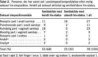 PEP efter SE blev ordineret til 54 mænd og 24 kvinder i årene 1998-2001. Medianalder var 29 år (spændvidde 15-58 år). Indekspersonerne var 69 mænd og ni kvinder. Indekspersonernes hiv-status var ukendt ved PEP-start i 25 (32%) tilfælde. Blandt disse havde ingen klinisk formodet hiv-infektion. Kun to af de 25 fik foretaget hiv-test (en negativ og et resultat uoplyst). Manglende hiv-test skyldtes overvejende, at der var tale om anonyme partnere, som ikke kunne kontaktes. Af de 25 tilhørte 24 en højrisikogruppe, 18 var homoseksuelle mænd, mens seks stammede fra højendemiske lande.