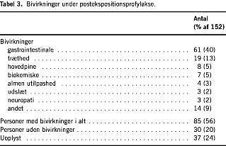 Bivirkninger, oftest gastrointestinale, var hyppigt forekommende (Tabel 3 ). Der var ingen væsentlig forskel på forekomsten af bivirkninger blandt seksuelt og erhvervsbetinget eksponerede (55,1% vs 56,8%). I alt ni personer skiftede behandling undervejs, heraf syv pga. bivirkninger. Bivirkninger førte til behandlingsophør i fem tilfælde.