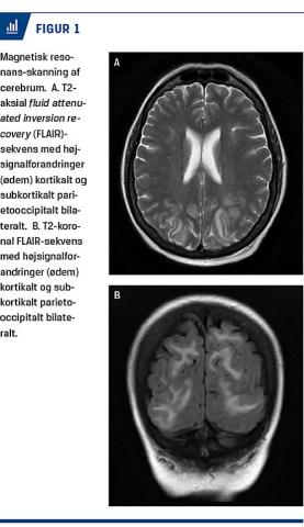 I forbindelse med kramperne blev der registreret normalt blodtryk (129/77 mmHg) og eGFR på 52 ml/min. En akut CT af cerebrum var uden sikre patologiske fund, mens en MR-skanning samme dag viste højsignalforandringer, der sad symmetrisk i occipitallapperne og strakte sig parietalt og frontalt (Figur 1). Forandrin-gerne var forenelige med PRES, og der blev ikke påvist tumorer i hjerneparenkymet. Samme dag måltes meget lavt P-magnesiumniveau på 0,37 mM, og dette blev korrigeret med i.v. givet magnesiuminfusioner, som gentoges de følgende dage pga. vedvarende tendens til hypomagnesiæmi. Det cerebrale ødem blev endvidere søgt behandlet med infusion af mannitol, loopdiuretikum og højdosisprednisolon, hvor sidstnævnte blev givet over en længere periode. Pga. øget intrakranialt tryk blev der ikke udført lumbalpunktur.
