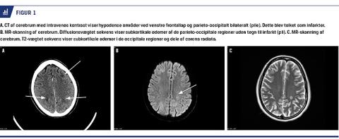 Fem timer senere udviklede patienten blindhed og hovedpine og fremstod konfus. Man påbegyndte behandling med MgSO4. To timer efter symptomdebut foretog man i generel anæstesi et ukompliceret sectio med fødsel af et rask barn, efter stabilisering af et blodtryk på 180/110 mmHg. En postoperativ CT af cerebrum viste infarkter og gav mistanke om sinustrombose (Figur 1A). Patienten blev overflyttet til et tertiært center under fortsat sedation med henblik på MR-skanning. Denne afkræftede sinustrombose, men bekræftede cerebralt ødem, hvilket tydede på PRES (Figur 1B og C). Patienten havde ingen synsudfald, da hun vågnede. MgSO4 blev seponeret efter 24 timer, og man påbegyndte behandling med tablet labetalol og nifedipin. Ved udskrivelse efter 16 dage havde patienten let hukommelses- og koncentrationsbesvær.