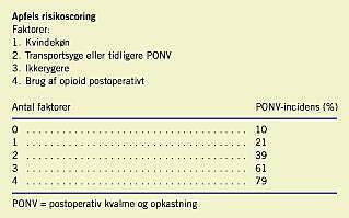 Apfel [7] udarbejdede en risikoscoring for PONV (se boks). Denne scoring er senere blevet valideret i flere andre studier. Man fandt fire prædiktorer for PONV efter inhalationsan-æstesi nemlig: kvindekøn, anamnese på transportsyge eller PONV, ikkerygning og postoperativ brug af opioid. Hvis ingen, en, to, tre eller fire risikofaktorer var til stede var incidensen af PONV henholdsvis 10%, 21%, 39%, 61% og 79%.