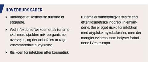 Kosmetisk turisme har øget fokus globalt. Implikationerne er rigt facetterede og spænder fra øgede udgifter for sundhedsvæsenet over den enkelte læge, som i fremtiden i højere grad vil møde patienter med komplikationer efter kosmetisk turisme, til patienten, som formodentligt har øget risiko for alvorlig infektion med atypiske mykobakterier. Der er behov for kvalitetsforskning om risici og komplikationer ved kosmetisk turisme sammenlignet med hjemlige tilbud med fokus på infektioner af hensyn til patientsikkerhed og for at belyse omkostningerne for sundhedsvæsenet.