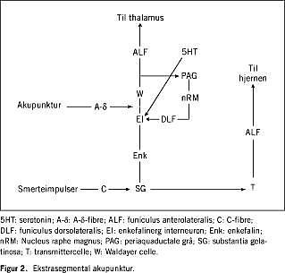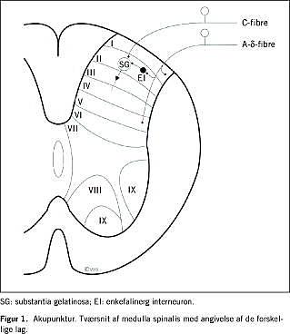 Årsagen til CRPS-type I er ukendt, men i princippet består CRPS-type I af mindst to komponenter: en autonom komponent og en smertekomponent. Chan [4] angiver som akupunkturens mulige virkningsmekanisme en påvirkning af sympaticus' tonus med efterfølgende normalisering af blodgennemstrømningen. Det er blevet foreslået af Petersen [2], at smerterne ved CRPS-type I kan skyldes en central/spinal hypersensibilisering. Den smertestillende effekt af akupunktur virker på flere niveauer, blandt andet på spinalt niveau, og man må formode, at denne mekanisme er involveret i dette tilfælde (se(Figur 1 , Figur 2 og Figur 3 ).