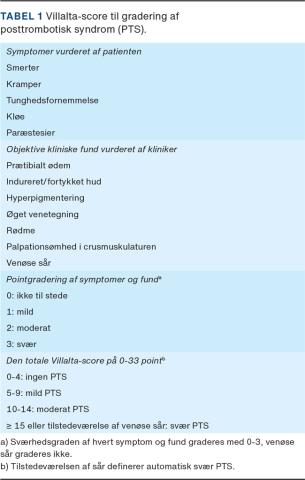 Posttrombotisk syndrom (PTS) er en hyppigt forekommende komplikation efter dyb venetrombose (DVT) i underekstremiteterne. PTS angives at forekomme hos 20-50% [1], men rapporteres endda hos så mange som 71% af patienter fem år efter iliacofemoral DVT [2]. PTS er defineret ved tilstedeværelsen af varierende grader af kliniske manifestationer, som forekommer i årene efter en DVT (Tabel 1) [3]. Svær PTS med smerter og hudforandringer ses hos 10-15%. Venøse sår på ankelniveau ses hos 5-10% [1]. Da symptomerne fra den akutte DVT kan persistere i flere måneder, kan diagnosen først stilles 3-6 måneder efter DVT. PTS er forbundet med negativ påvirkning af patienternes livskvalitet (QOL) samt betydende samfundsøkonomiske omkostninger i form af udgifter til sygemelding, hospitalisering og ambulant behandling [4].