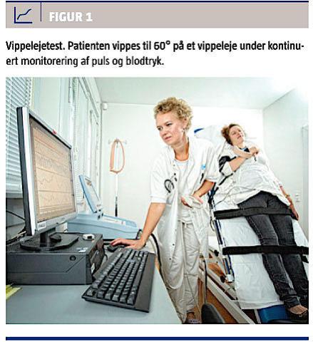 Sammen med en grundig anamnese er vippelejetest (Figur 1) central i diagnosticeringen af kronisk ortostatisk intolerans, men det er formentlig kun en brøkdel af patienterne med ortostatisk intolerans, der får foretaget en vippelejetest, og tilstanden skønnes at være markant underdiagnosticeret. Estimering af prævalensen er således vanskelig. I USA var antallet af patienter med kronisk ortostatisk intolerans estimeret til en halv million i 1999 [2]. Omsat til danske forhold vil det svare til, at ca. 10.000 er afficeret herhjemme.