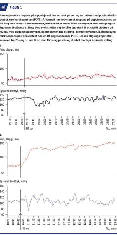 Stigning i hjertefrekvens på mindst 30 slag pr. minut eller til mindst 120 slag pr. minut er diagnostisk, hvis der samtidigt er betydelig ortostatisk intolerans og ikke andre åbenlyse årsager til takykardien (Figur 1). Hos unge (12-19 år) ses et kraftigere fysiologisk hjertefrekvensrespons på ortostatisk stress end hos voksne, hvorfor en stigning på 40 slag pr. minut er diagnostisk i denne aldersgruppe [2]. Ud over den ortostatiske intolerans beskriver patienter med POTS ofte symptomer, der ikke er relateret til ortostatisk stress – kvalme, mavesmerter, træthed, søvnforstyrrelser og hovedpine [1]. POTS er ikke en »ny« sygdom. En klinisk tilstand, der minder om POTS, blev beskrevet allerede i 1871 af da Costa hos soldater i den amerikanske borgerkrig og kaldt irritable heart syndrome [3]. Siden er kombinationen af uhensigtsmæssig ortostatisk takykardi og ortostatisk intolerans beskrevet under flere navne. I 1993 blev betegnelsen postural ortostatisk takykardisyndrom foreslået [4], og siden 2006 har POTS i henhold til Sundhedsstyrelsen været klassificeret under supraventrikulære takykardier med diagnosekoden DI471J.