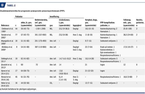 PPP til gradvis øgning af den abdominale komplians blev første gang beskrevet af Moreno i 1947 [16]. Under lokal eller generel anæstesi etableres intraperitoneal adgang med Veress-nål i Palmers point eller ved anlæggelse af et stationært transabdominalt kateter. Via indstik eller operativt anlagt kateter instilleres