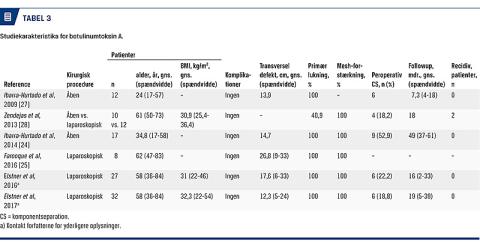 BTX injiceres ultralydvejledt. Der anlægges depoter i hver af de tre skrå muskler bilateralt. Antallet af indstiksstederne varierer fra tre til fem på hver side. I relation til hvert indstikssted anlægges et BTX-depot (i hvert af de tre muskellag), i alt 50 enheder. Paralysen resulterer i en udtynding og samtidig forlængelse af muskulaturen [24, 25]. Sekundært ses øgning af abdominalkompliansen [26] med reduktion af den transverselle defektstørrelse med op til 38% [27] som følge af nedsat lateral traktion af bugvæggens skrå muskulatur. Herved faciliteres ikke blot lukningen af defekten (ved både åben og laparoskopisk kirurgi), den lange virkningsvarighed menes samtidig at beskytte fascien og mesh-integrationen under helingsfasen ved at minimere de laterale biomekaniske kræfter (Tabel 3).