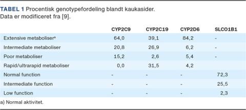 CYP450 LM-metaboliserende enzymer spiller en central rolle i biotransformationen af 70-80% af LM i klinisk brug [6] til enten inaktive metabolitter eller aktive stoffer (prodrugs). Især er CYP450-subenzymerne CYP2C9, CYP2D6 og CYP2C19 centrale i at forstå forskelle i LM-respons og -bivirkninger [1, 7]. Variation i generne (genetisk polymorfi) kan medføre, at aktiviteten af CYP450-enzymerne er stærkt nedsat eller ikke til stede. Dette vil medføre, at LM ikke bliver metaboliseret og kan føre til utilsigtet overdosering og introduktion af bivirkninger [7]. På den anden side kan genet også være overudtrykt, hvilket fører til en øget aktivitet af CYP450-enzymerne og dermed en hurtigere omsætning af LM med deraf manglende farmakologisk virkning [6]. Undersøgelse for genetisk polymorfi vha. en PGx-test kan dermed være et nyttigt værktøj til at identificere en farmakologisk sammenhæng mellem et LM (drug) og en genetisk variant, kaldet »drug-gene interaction« (DGI), som kan påvirke en patients respons på LM-behandling. Baseret på DGI-scorer for metabolisk aktivitet [2] klassificereres disse i fem forskellige genotyper/fænotyper: poor metaboliser (PM), intermediate metaboliser (IM), extensive metaboliser (EM, normal aktivitet) og rapid og ultra-rapid metaboliser (RM og UM) (Figur 1). Vi bruger udtrykket UM for både RM og UM i denne artikel. Samme betragtninger gælder også for statintransportøren SCLO1B1, hvor en PGx-test kan identificere, om en person har normal function (NF), intermediate function (IF) eller low function (LF). Der ses en øget forekomst af myopati ved IF og LF [8] især ved høje doser af statiner. Fordelingen mellem de forskellige genotyper fremgår af Tabel 1 for de forskellige CYP450-enzymer og SLCO1B1.