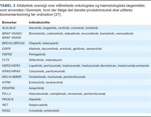 Prædiktive biomarkører har igennem de seneste 20 år spillet en stadig større rolle ved brugen af målrettet LM inden for onkologi og hæmatologi. Det første LM, hvor der parallelt med udviklingen af lægemidlet blev udviklet en prædiktiv biomarkørtest, var det monokolonale antistof trastuzumab til behandling af HER2-postiv brystkræft. Da trastuzumab i 1998 blev godkendt af FDA, skete det sammen med et immunhistokemisk assay til detektion af HER2-ekspression i tumorvævet [27]. Siden er antallet af prædiktive biomarkørtest knyttet til målrettet LM steget støt, og i dag er der i Danmark ca. 40 LM, hvor det er anført i produktresuméet, at testning er påkrævet før ordination [28]. Disse LM og deres biomarkører er oplistet i Tabel 3. I den engelske litteratur betegnes denne type prædiktive biomarkørtest knyttet til et specifikt LM som CDx. I den nye EU-forordning for medicinsk udstyr til in vitro-diagnostik (IVD) oversættes CDx til »udstyr til ledsagende diagnosticering« [29]. Anvendes LM i Tabel 3 uden en forudgående testning, vil det ofte betyde, at de vil miste deres værdi, idet LM’s effekt specifikt er knyttet til detektion af molekylære forandringer ofte med meget lave prævalenser. For patienter med ikke småcellet lungekræft er 1-2% ROS1-positive og dermed kandidater for behandling med crizotinib eller entrectinib, og for de RET-positive er det ca. 1-2%, som vil have mulig gavn af behandling med selpercatinib [30] (Tabel 3).