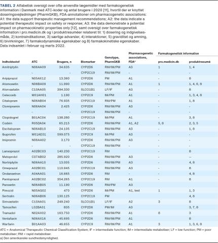 PharmGKB [2] indeholder bredt anerkendte kliniske doseringsvejledninger (KDV) for DGI for en lang række LM. Disse KDV giver, baseret på DGI-score, anbefalinger for dosisjustering, dosisovervågning eller brug af alternative LM. FDA anerkender vigtigheden af DGI og har udarbejdet PGx-anmærkninger for et stort antal LM [10], ligesom EMA har [2], dog i mindre omfang. Tabel 2 viser forbruget af lang række LM i Danmark med tilknyttet KDV baseret på PGx-information samt de af FDA tilknyttede anmærkninger. Som det ses, er der relativt mange brugere af de forskellige LM. Tages genotypefordelingen i betragtning jf. Tabel 1, vil mange mennesker potentielt kunne have gavn af en PGx-test. Promedicin.dk og produktresuméerne indeholder PGx-baseret information, dog uden egentlige anbefalinger.