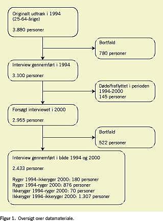 I den originale stikprøve fra 1994 blev 3.880 personer i aldersgruppen 25-64 år udtrukket (Figur 1 ). Af disse blev der gennemført interview i både 1994 og 2000 med i alt 1.056 personer, som angav, at de var rygere ved indgangen i studiet i 1994. Svarpersoner i alderen 16-24 år blev ekskluderet, idet det ikke er meningsfuldt at klassificere ældre teenagere og yngre voksnes sociale position. Endvidere var der få rygere blandt de unge, som holdt op med at ryge i perioden fra 1994-2000. Også personer over 64 år blev ekskluderet, idet denne alderskategori ikke kan klassificeres i forhold til erhverv.