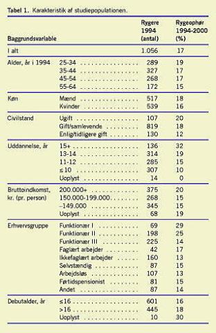 Tabel 1 viser karakteristika for studiepopulationen ved indgangen i studiet i 1994 og andelen, der angav, at de ikke længere røg ved interviewet i 2000. Af de 1.056 25-64-årige, som røg ved indgangen i studiet, angav 180 (17%), at de ikke røg i 2000.