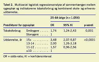 Konklusion: Det var forventeligt, at tobaksforbrug havde betydning for rygeophør, idet forbrug er associeret med nikotinafhængighed, som vanskeliggør rygeophør. Betydning af uddannelse for rygeophør reflekterer muligvis graden af viden om rygnings skadelige effekter. Yderligere arbejder lavt uddannede oftere i miljøer, hvor rygning er accepteret. Viden om, hvilke grupper der har mindre sandsynlighed for rygeophør, kan være nyttig i fremtidige rygeophørsinterventioner.