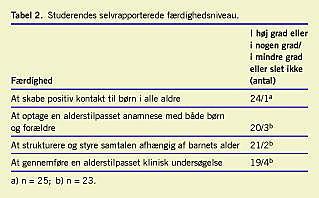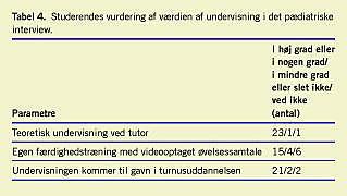 De fleste studenter mente at have haft gavn af den teoretiske undervisning i det pædiatriske interview (Tabel 4 ). Derimod angav kun 15 (60%) studenter, at øvelsessamtalerne i høj grad eller i nogen grad kunne anvendes til erhvervelse af kommunikative pædiatriske færdigheder. Endelig forventede flertallet (84%), at undervisningen i det pædiatriske interview i høj eller i nogen grad ville komme dem til gavn i turnusuddannelsen.