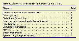 Næsten alle studerende mente selv at beherske målbeskrivelsens færdigheder i pædiatrisk kommunikation i nogen eller i høj grad (Tabel 2 ). Der var ingen forskel i det selvrapporterede færdighedsniveau blandt studenter, som henholdsvis gennemførte øvelsessamtalen eller undlod dette (Mann-Whitneys U-test, p = 0,32). Sygdomsdiagnoser og alder på de deltagende børn fremgår af Tabel 3 .