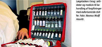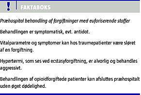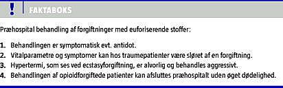 Summary Prehospital treatment of intoxications with euphorizing drugs Ugeskr Læger 2012;174(39):2297-2300 Acute intoxications are frequently seen in the prehospital setting and are often either a mixture of multiple drugs or supplemented with other drugs such as alcohol or marihuana. In contrast to the in-hospital setting, where intoxications can be detected with blood, sweat or urine tests, the prehospital physician may need to act on the symptomatology rather than the aetiology. Symptoms can be divided into two main groups depending on whether they are promoting or inhibiting vital functions. This article gives an update on management of intoxications with central stimulants in the prehospital setting.