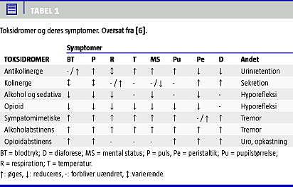 Nogle forgiftninger er alvorlige og kræver hurtig intervention, og den præhospitale læge er nødt til at handle på baggrund af ufuldstændige oplysninger. I alarmmeldingen kan man blive præsenteret for en forgiftningsanamnese, som f.eks.: »Indtagelse af Mitsubitsi, Eksplosion eller Bosnisk Benzo«, uden at ambulancelægen kan få oplysninger om, hvad indholdsstoffet er. Ofte er der tale om en blandingsforgiftning, og stofindtagelsen kan endda være suppleret med andre rusmidler som alkohol eller hash. I modsætning til skadestuearbejdet, hvor forgiftningens ætiologi ofte kan erkendes i blod-, sved- eller urinprøver [2], kan det præhospitalt være mere hensigtsmæssigt at opdele forgiftningerne efter symptomatologi, de såkaldte toksidromer (Tabel 1 ), som er kombinationen af en række symptomer såsom ændringer i puls, blodtryk, vejrtrækning, temperatur, pupilstørrelse, svedmængde og mental status. Symptomerne skyldes stoffets eller toksinets enten stimulerende eller hæmmende virkning på centralnervesystemet (CNS) [3-6].