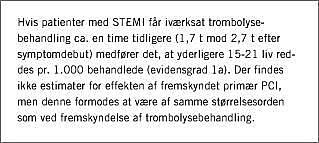 Den prognostiske gevinst, der opnås ved at fremskynde behandlingen med trombolyse, er belyst i studier, der omhandler præhospital vs. hospital trombolyse. De enkelte studier har ikke selvstændigt haft styrke til at påvise mortalitetsreduktion ved præhospital trombolyse i forhold til med hospital trombolyse. En metaanalyse over seks af disse studier (n=6.434) viser dog en reduktion i 30-dages-mortalitet fra 10,2% til 8,6%, p=0,03 (evidensgrad 1a) ved præhospital frem for ved hospital trombolyse [34]. Mortalitetsreduktionen var primært betinget af lavere hospital mortalitet og svarede til, at ekstra 16 patienter overlevede pr. 1.000 behandlede, hvis trombolyse blev initieret præhospitalt frem for hospitalt. I to tilsvarende metaanalyser er den prognostiske gevinst estimeret til 15 og 21 ekstra redede liv pr. 1.000 behandlede med præhospital frem for hospital trombolyse [4, 11]. Effekten af præhospital trombolyse på langtidsmortaliteten synes at være uafklaret. Den præhospitale trombolyse blev i ovennævnte studier iværksat gennemsnitlig 58 min før den hospitale (1,7 t mod 2,7 t efter symptomdebut).