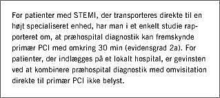For patienter med STEMI, der transporteres direkte til en højt specialiseret enhed, har man i et enkelt studie rapporteret om, at primær PCI kan fremskyndes 29 min, hvis man foretager præhospital diagnostik og varsler hospitalspersonalet (evidensgrad 2a) [35]. Behandlingsforsinkelserne fra ankomst til en højt specialiseret enhed til iværksættelse af primær PCI blev således reduceret fra 109 min til 80 min. I Danmark er de tilsvarende forsinkelser på omkring 90 min, hvis patienterne indlægges direkte på en højt specialiseret enhed uden brug af præhospital diagnostik, og 30 min for patienter, der overflyttes fra et lokalt hospital til en højt specialiseret enhed, betinget af, at man i sidstnævnte tilfælde er varslet forud for patientens ankomst [36].