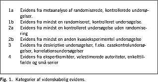 I forbindelse med gennemførelse af et medicinsk teknologivurdering (MTV)-projekt [5] blev der foretaget en systematisk litteratursøgning i databaserne MEDLINE (inklusive Cochrane Library) og HealthSTAR. Søgningen er opdateret pr. 1. september 2002, og søgestrategien kan rekvireres hos forfatterne. Hvis et studie belyste formålet for nærværende artikel, blev evidensgraden fastlagt i henhold til klassifikationen i Fig. 1 .