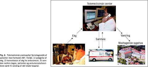 Præhospital AMI-diagnostik forudsætter optagelse af ekg og fastlæggelse af sygehistorien forud for patientens indlæggelse. I hidtidige studier er præhospital AMI-diagnostik blevet varetaget af paramedicinere (ambulancebehandlere med supplerende sundhedsfaglig uddannelse) [6, 7], sygeplejersker [6], praktiserende læger/vagtlæger [8, 9], ambulancelæger [10-15], med computeralgoritmer [16, 17] eller af hospitalslæger [18-22]. Sidstnævnte fordrer brug af telemedicinsk teknik med henblik på ekg-transmission fra ambulancen og samtale mellem hospitalslægen og ambulancebehandleren eller patienten (Fig. 2 ).