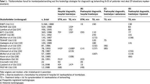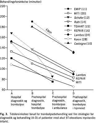 Forsinkelser forud for trombolysebehandling er afhængig af, hvilken strategi man anvender (Tabel 1 ). I Danmark får patienter med STEMI stillet diagnosen og indledt behandlingen efter ankomsten til et hospital (strategi A). Som det fremgår af Fig. 3 og Tabel 2 kan hospital trombolyse fremskyndes 20-40 min, hvis præhospital diagnostik anvendes til at varsko hospitalspersonalet og visitere patienterne direkte til en hjerteafdeling (evidensgrad 1b-2a) [3, 6, 12, 19-22, 29]. Dette er i overensstemmelse med lokale erfaringer fra Århus Amt (30). Hvis behandlingen iværksættes i ambulancen eller i hjemmet, er der rapporteret om 42-83 minutters reduktion i behandlingsforsinkelse (evidensgrad 2a) (Tabel 2) [3, 12, 16, 20, 23, 24, 26, 28]. I to hollandske studier, hvor ambulancetransporttider var sammenlignelige med danske forhold (10-13 min), rapporteres om reduktion i behandlingsforsinkelse på 50 min og 63 min, ved indførelse af præhospital trombolyse (evidensgrad 2a) (Tabel 2) [16, 23, 24]. I samme studier rapporteredes, at 19-40% af patienterne fik iværksat behandling inden for 1 t efter symptomdebut ved indførelsen af præhospital trombolyse (strategi D) mod 0-1% ved traditionel hospitaldiagnostik og -trombolyse (strategi A) [24]. I det nyligt publicerede ER-TIMI 19 Trial rapporteredes om reduktion i behandlingsforsinkelse på 31 min ved indførelse af præhospital trombolyse. I kontrolgruppen, der modtog hospital trombolyse, havde halvdelen dog fået foretaget præhospital diagnostik, hvorfor den sande tidsgevinst må være større ved indførelse af nævnte strategi i lande som Danmark, hvor AMI-diagnosen fortsat primært fastlægges efter ankomsten til et hospital [31].