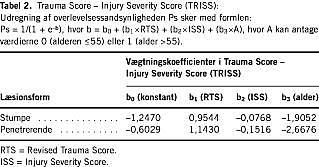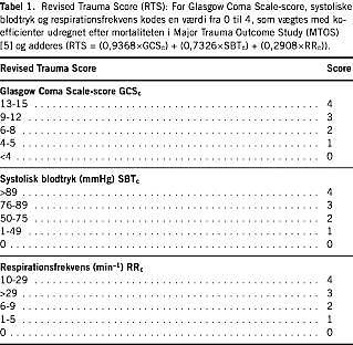 Der er fokus på kvalitet og kvalitetsvurdering af sundhedsvæsenets ydelser, og viden herom inden for det præhospitale felt er sparsom. For at vurdere effekt og kvalitet af behandling af alvorligt tilskadekomne er det nødvendigt at kunne sammenligne sværhedsgrad og risiko for død, hvilket ikke er muligt ud fra Nordisk Ulykkesklassifikation og ICD 10-diagnoser, som er basis i den danske registrering. I stedet anvendes en række traumescorer [1-6], hvor Revised Trauma Score (RTS) beskriver patientens fysiologiske tilstand. RTS udregnes på basis af systolisk blodtryk (SBT), spontan respirationsfrekvens (RR) og Glasgow Coma Scale-score (GCS) [3] (Tabel 1 ). Der er vanskeligheder ved at registrere RTS: Endotrakealt intuberede patienter kan ikke tale, hvorfor verbalt respons ikke kan opnås til vurdering af GCS, og anæstesi, intubation og ventilation påvirker direkte RR, GCS og SBT. RTS anvendes dels til triage, og i en vægtet form indgår RTS i den internationalt hyppigt anvendte Trauma Score - Injury Severity Score (TRISS)-analyse, som anvendes til at sammenligne den aktuelle overlevelse med den forventede overlevelse [4-5, 7-9] (Tabel 2 ). Til TRISS anvendes der værdier, der er målt efter ankomst til hospital, og det betyder, at præhospitalt intuberede patienter helt må udgå eller indgå i modificeret form i TRISS-analyser.