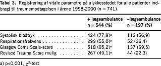 I perioden blev der indbragt 741 potentielt kritisk tilskadekomne patienter, hvoraf hovedparten, 544 patienter, blev indbragt med lægeambulanceassistance. Blandt disse var 91 patienter blevet endotrakealt intuberet præhospitalt. I Tabel 3 er det angivet, i hvilket omfang de enkelte værdier var registreret for patienter indbragt med eller uden lægeambulanceassistance. Generelt var der flere dokumenterede værdier for patienter, der var indbragt med lægeambulanceassistance, end for de øvrige. GCS var i begge tilfælde den hyppigst dokumenter ede værdi hos 518 (95,2%) af lægeambulancens patienter og hos 137 (69,5%) af de øvrige (p< 0,001). Den værdi, der var dårligst dokumenteret, var RR, som fandtes hos 299 (55,0%) af lægeambulancens patienter og 52 (26,4%) af de øvrige patienter (p< 0,001).
